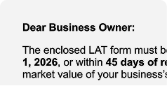 The LAT form must be completed and returned to this office no later than April 1, 2026, or within 45 days of receipt.